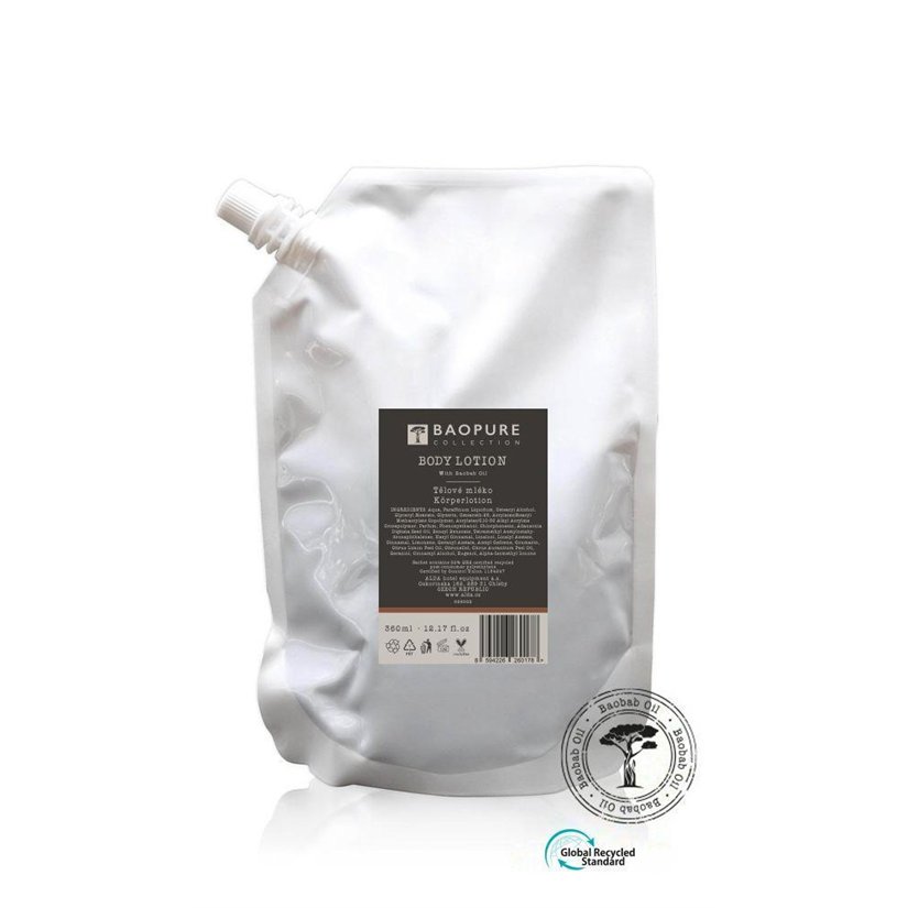 The BAOPURE collection body lotion in a practical 360 ml refill bag provides intensive hydration and gentle skin care. It contains baobab oil, which nourishes and leaves the skin soft and pleasantly scented with citrus, floral and woody notes. The gentle formula, free of parabens and silicones, is ideal for everyday use. Refill packaging reduces plastic consumption and is suitable for refilling original bottles.