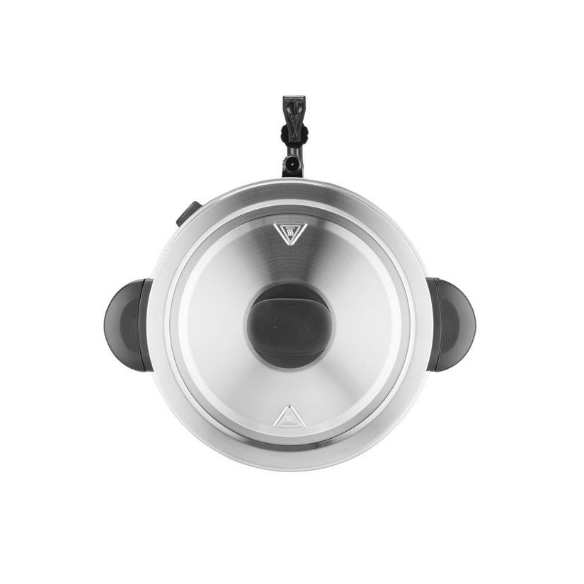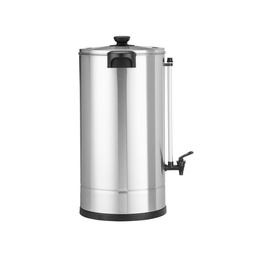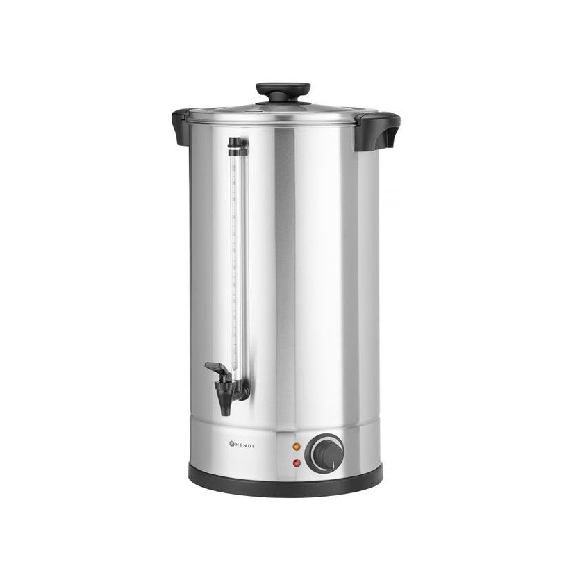 Kettle for water, total volume 30 l from the company Hendi with catalog number 211151. Single-layer walls of polished stainless steel, lid equipped with safety closure type "Twist-Lock" polypropylene handle, comfortable grips that do not heat up and tap, easy-to-read level gauge marked in liters. On/off with silicone protection, light signaling for heating and maintaining the desired temperature. The heating element is under the bottom of the tank, protected from scale. The thermos has protection against overheating. The kettle is suitable for preparing mulled wine or boiling water, automatically switching the heating function and maintaining the required water temperature for serving. The device is not suitable for preparing hot chocolate. Maximum height of the kettle for pouring water with a tap: 130 mm (without drip tray). Temperature adjustable using a thermostat in the range: from 30°C to 100°C.