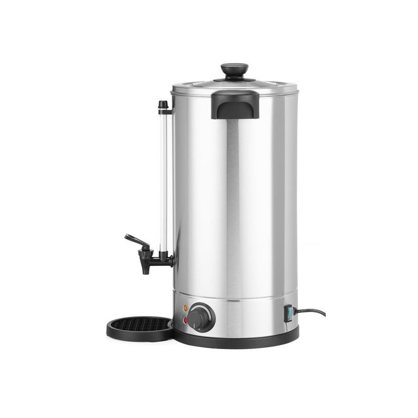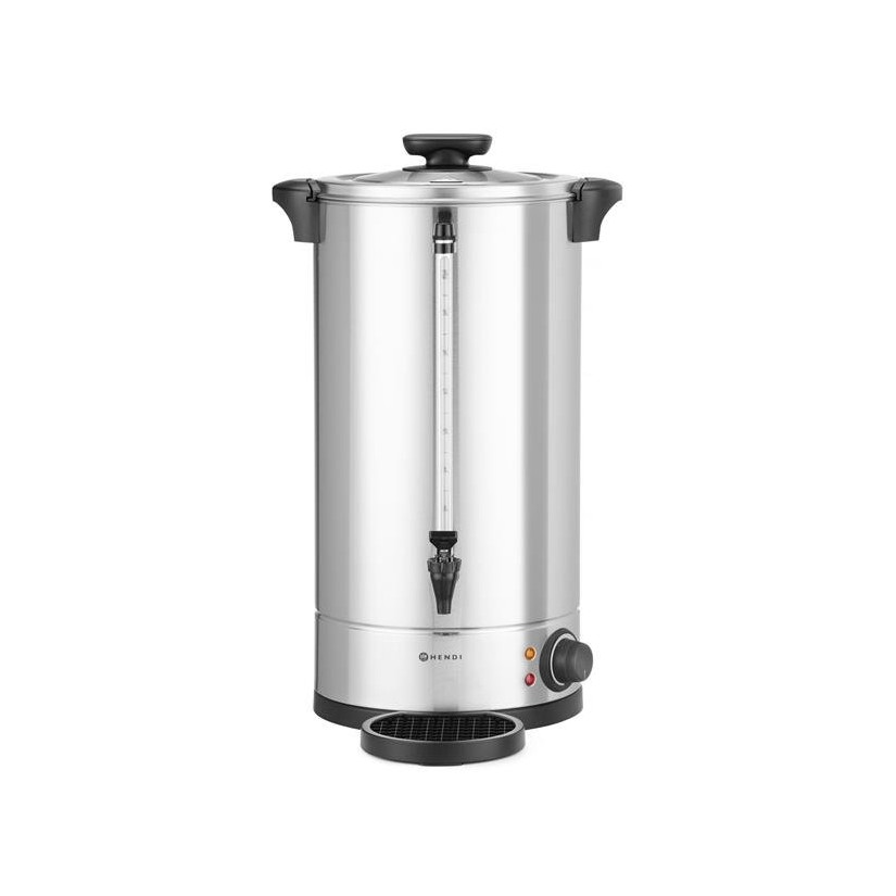 Kettle for water, total volume 20 l (usable volume 18 l) from Hendi with catalog number 211175. Double-wall insulated walls in polished stainless steel that guarantee minimal heat loss, which allows economical operation. The lid is equipped with a "Twist-Lock" safety closure, a polypropylene handle, comfortable grips that do not heat up and a faucet, a well-read level gauge marked in liters. On/off with silicone protection, light signaling for heating and maintaining the desired temperature. The heating element is under the bottom of the tank, protected from scale. The thermos has protection against overheating. A drip tray is included in the package. The kettle is suitable for preparing mulled wine or boiling water, automatically switching the heating function and maintaining the required water temperature for serving. The device is not suitable for preparing hot chocolate. Maximum height of the kettle for pouring water with a tap: 130 mm (without drip tray). Temperature adjustable using a thermostat in the range: from 30°C to 100°C.