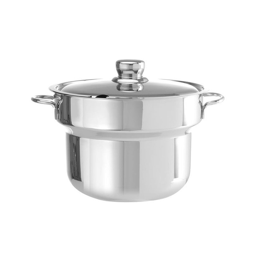 - The round soup pot is placed in a large pot of water that provides enough heat to easily keep the soup hot