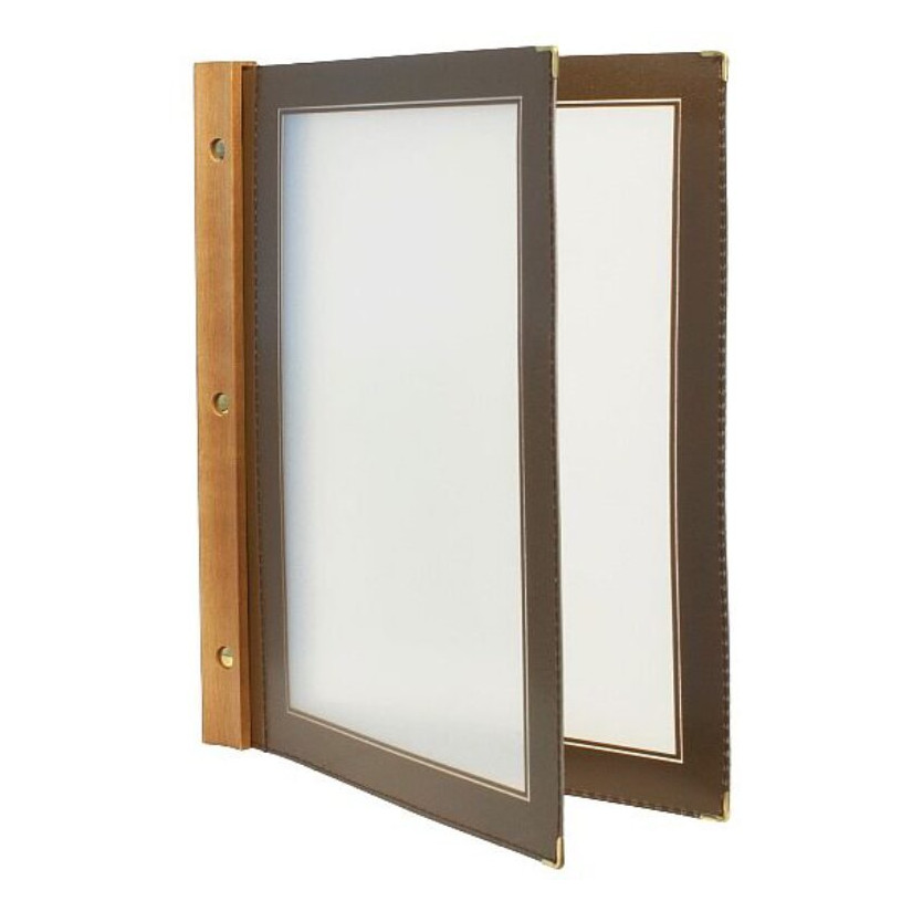 Menus of the WOOD series have a hard back made of solid wood. Double-sided inserts with sewn edges in different colors are inserted into the back.