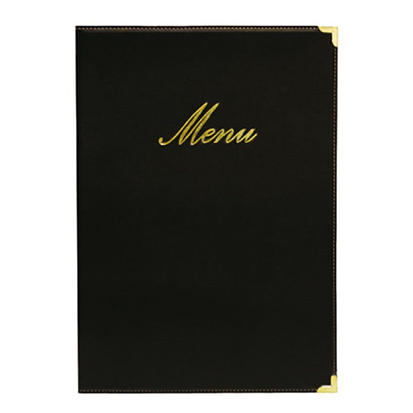 Menu cards of the CLASSIC series are made of leather imitation material. They come in the following colors: black, burgundy, ivory, brown. CLASSIC series products have metal protective edge corners, which are appreciated by users in restaurants with a lot of guest traffic. The food and drink tickets of the CLASSIC series are printed with an embossed inscription in gold color. The delivery includes 1 insert for a total of 4 pages of the offer.