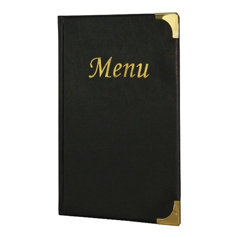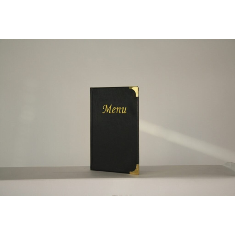 Simple PVC menu cards with embossed gold lettering and metal protective corners. They have 4 firmly attached inserts, the total capacity is 10 pages of the offer. It is not possible to change or add inserts to the menus of the BASIC series.
