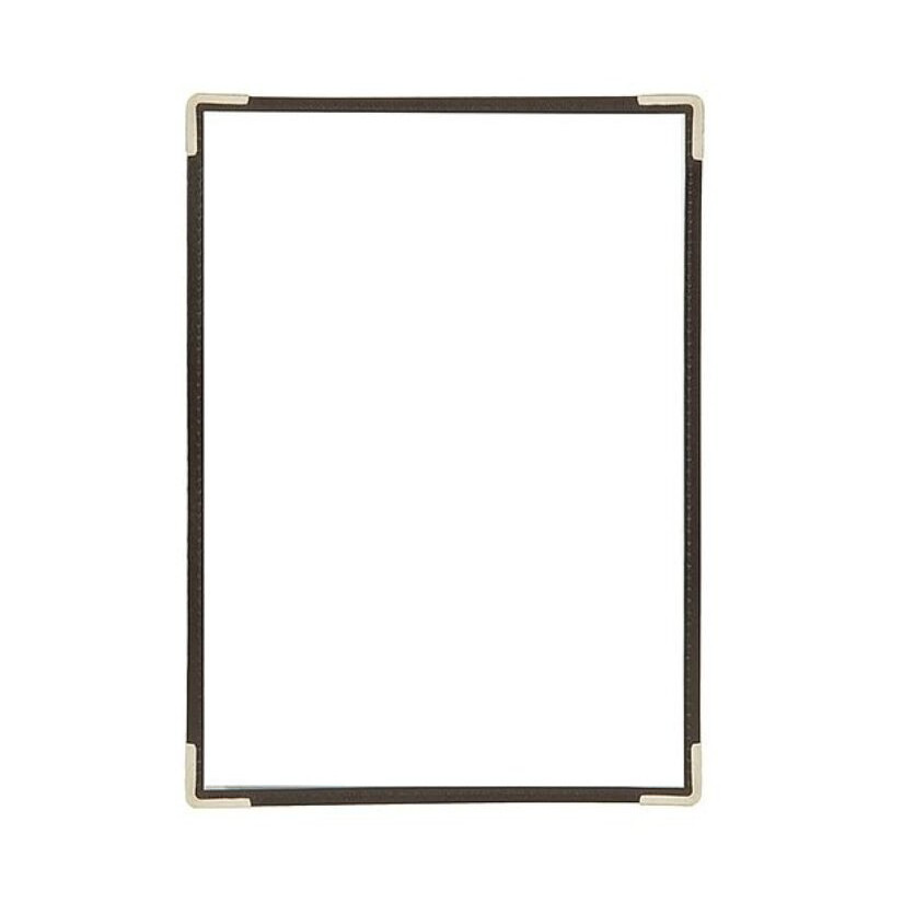 Transparent double-sided menu made of anti-reflective material without plates. The thin frame in brown color is made in a leather pattern, with protective chrome metal corners.