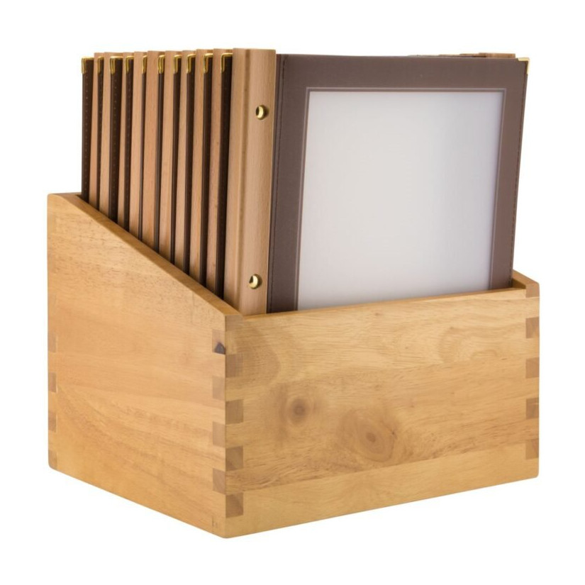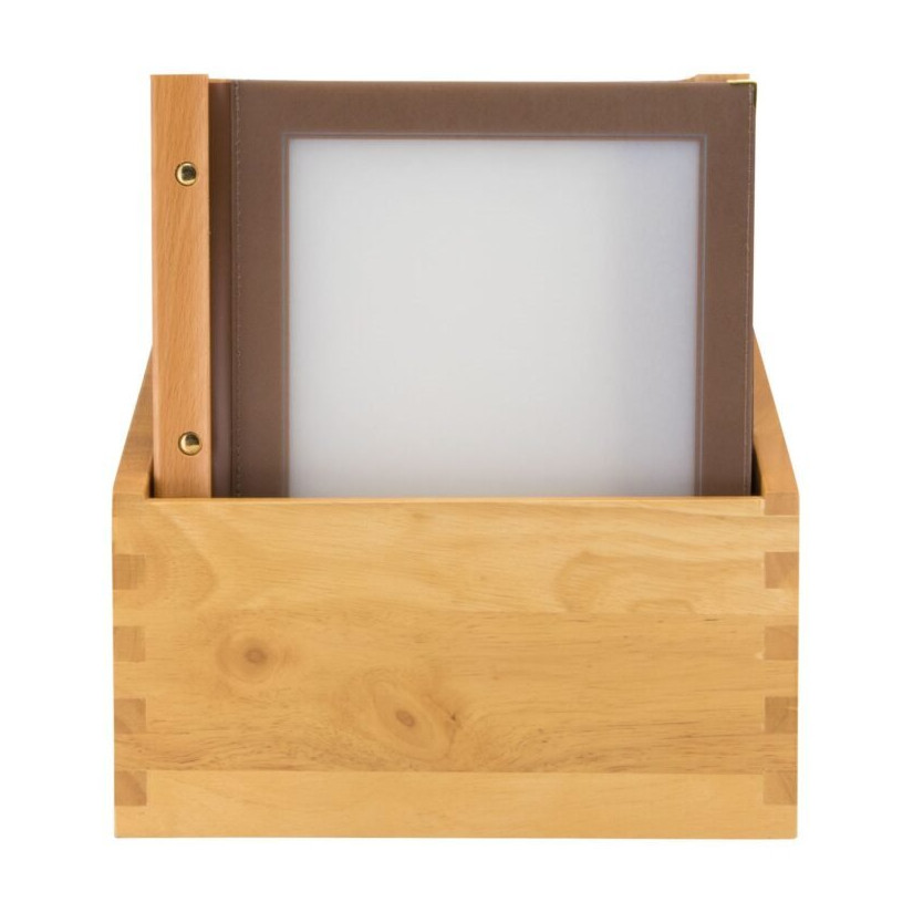 A robust box made of solid wood contains 20 leaves with wooden spines and inserts with colored edges. The inserts are transparent, made of anti-reflective material. They are flexible and washable and scratch resistant. They are attached to the back with three screws in brass finish. The inserts have metal protective corners in a brass finish. The delivery of each of the 20 menus includes two plates (4 pages).