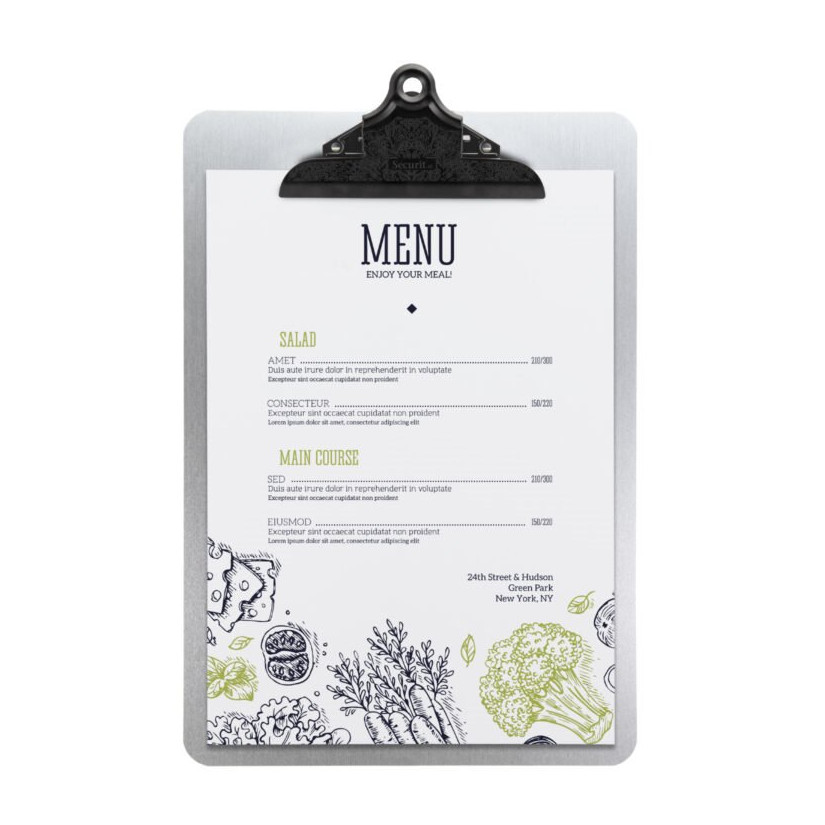 A simple menu in A4 format, for the daily menu, which can be attached with a metal clip.