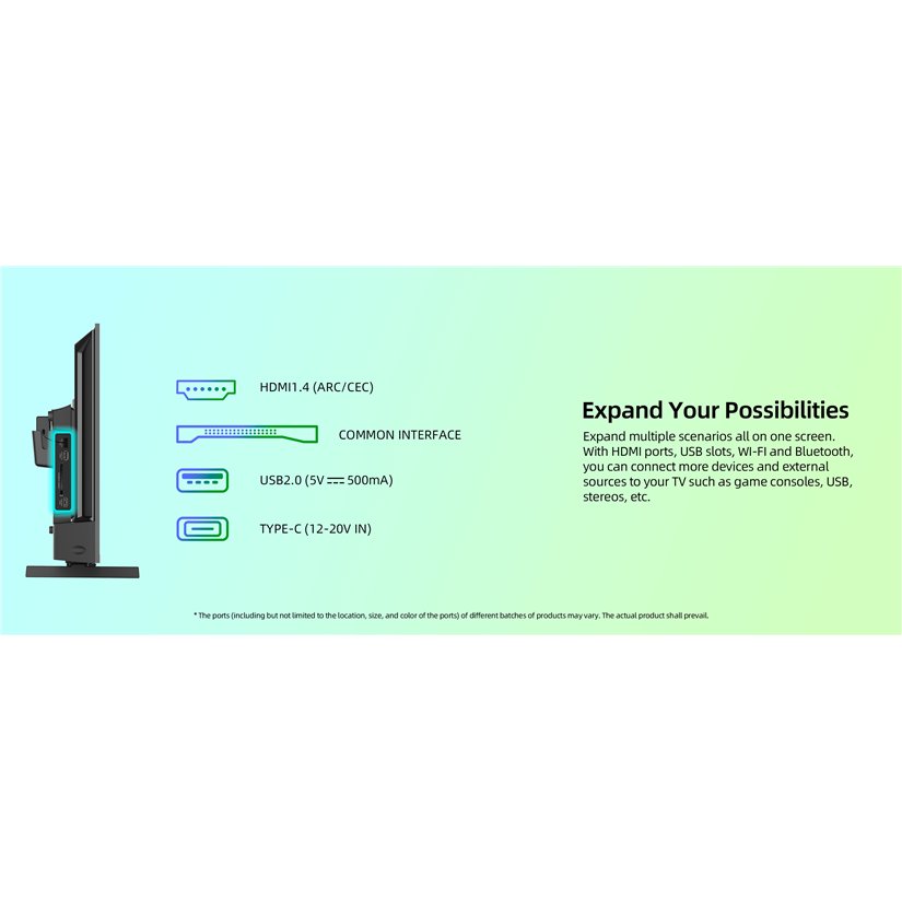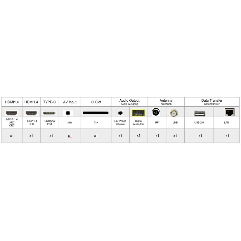 - USB-C, AV input mini, CI+, 3.5 mm headphone input, digital audio output, HDMI 1.4, ARC CEC, USB 2.0, LAN, RF and LNB antennas