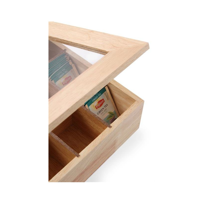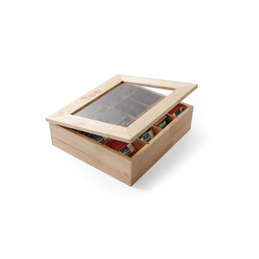 Ovaj ormarić je izrađen od drveta i ima prirodnu svijetlu nijansu. Njegov poklopac je izrađen od drvenog okvira, koji je nadopunjen akrilnim prozorom na šarkama, i otvara se prema gore. Unutar ormarića nalazit će se 12 pregrada koje su idealne za pohranu vrećica čaja - svaka pregrada može primiti do 12 vrećica.