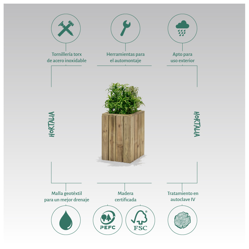 Kolekcija ATRIUM tvrtke Hortalia dizajnirana je s naglaskom na estetiku do najsitnijeg detalja. Ovi sanduci karakteriziraju vertikalna raspored slatki. Spajanjem četiri strane kutije stvaraju se savršeni rubovi. Drvo je pažljivo polirano, što osigurava glatku i homogenu površinu. Također uključuje ukrasni okvir s zaobljenim rubovima na vrhu. Osim toga, cijela kolekcija izrađena je koristeći torx vijke od nehrđajućeg čelika, što jamči dugi vijek trajanja proizvoda na otvorenom.
