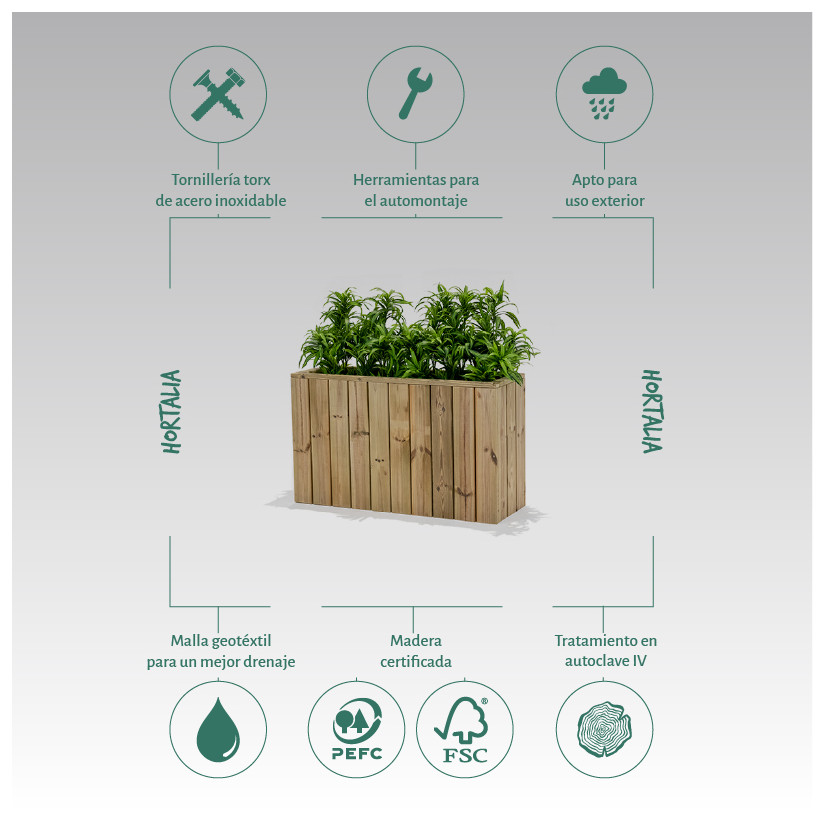 Kolekcija ATRIUM tvrtke Hortalia dizajnirana je s naglaskom na estetiku do najsitnijih detalja. Ovi sanduci karakteriziraju vertikalno raspoređene letvice. Spajanje četiriju strana kutije stvara savršene rubove. Drvo je pažljivo polirano, što osigurava glatku i homogenu površinu. Također uključuje ukrasni okvir s zaobljenim rubovima na vrhu. Osim toga, cijela kolekcija izrađena je koristeći nehrđajuće čelične vijčane spojeve torx, što jamči dug vijek trajanja proizvoda na otvorenom.