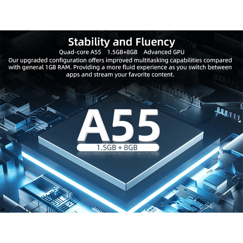 Visoko performantan 64-bitni četverojezgreni procesor A55 koristi najnoviju tehnologiju nanočestica i lako dekodira video zapise iz različitih formata. Njegovo funkcionisanje je potpuno glatko i garantuje brz odziv. Kućna zabava nikada nije bila tako sjajna. Plus veliki kapacitet memorije od 8G vam omogućava da instalirateveliki broj aplikacija uz održavanje dovoljno slobodnog prostora.