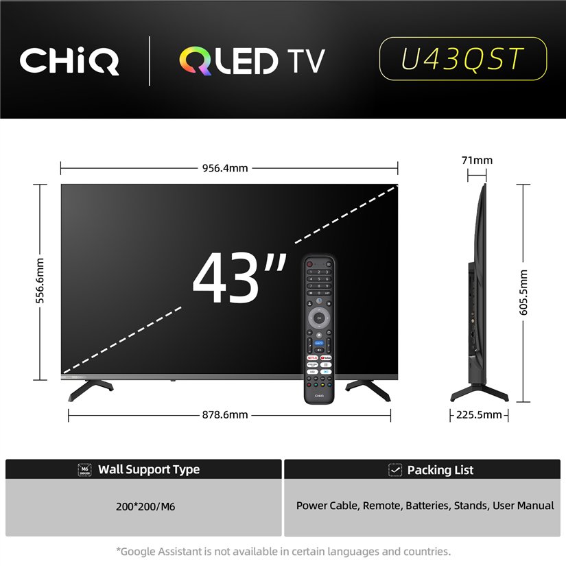 CHiQ U43QST – UHD QLED Google TV bez okvira s DLG 120 Hz, 43” (109 cm), ultra tanki, 2+2 godine jamstva