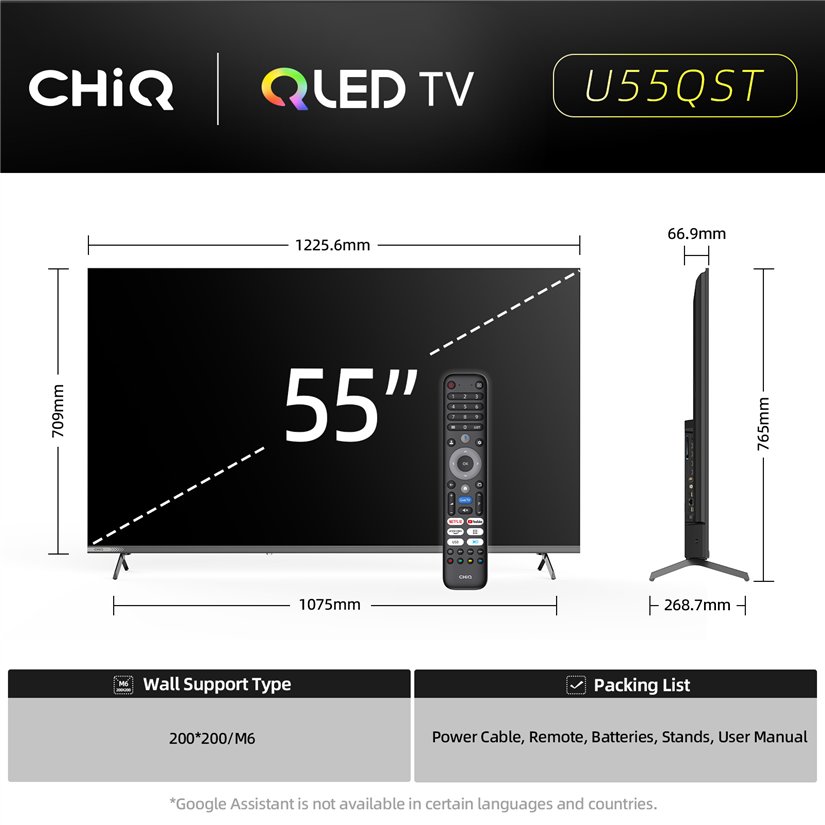 Ultra tanki bezrubni QLED televizor CHiQ U55QST s dijagonalom od 55" namijenjen je zahtjevnim korisnicima koji očekuju vrhunske slike, glatki prikaz pokreta i moderne pametne funkcije. Zahvaljujući Ultra HD rezoluciji i QLED tehnologiji, nudi izuzetno oštre slike, visoki kontrast i bogato prikazivanje boja koje će se istaknuti prilikom gledanja filmova, serija i sportskih prijenosa.
