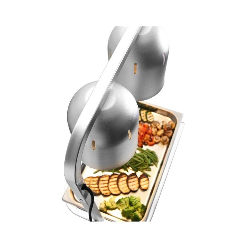 Heating lamp for heating food. Very convenient and easy to use, recommended for large restaurants, catering companies, hotels and wedding houses. Designed to keep food warm between preparation and serving. The height is easily adjustable between 590 and 790 mm. Including unbreakable lamps.