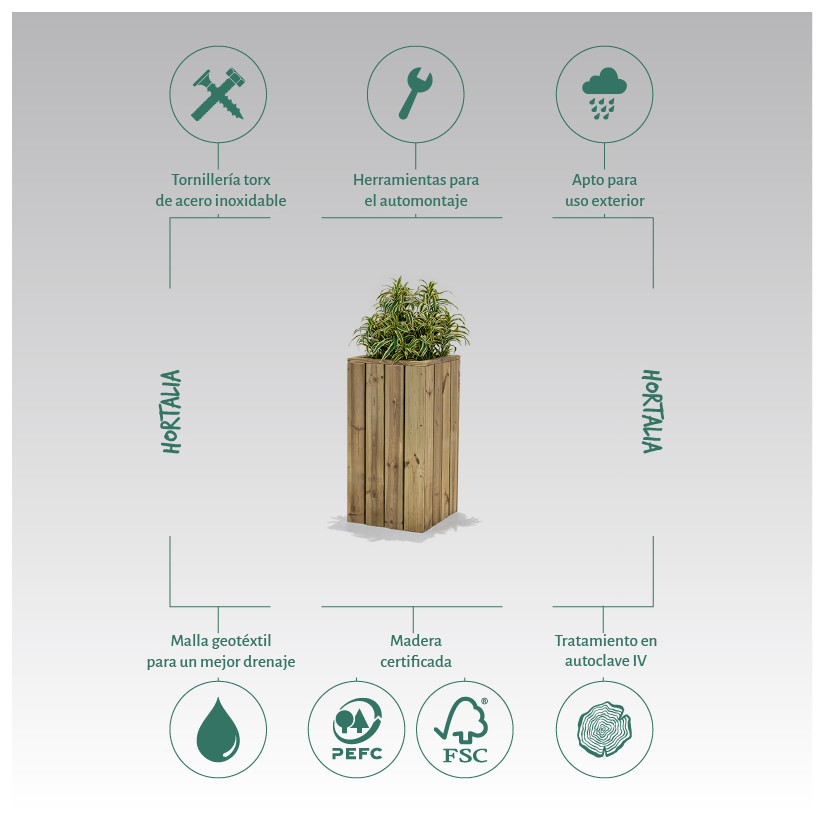 Colecția ATRIUM de la Hortalia a fost proiectată cu accent pe estetică până în cel mai mic detaliu. Aceste cutii sunt caracterizate printr-o aranjare verticală a ţiglelor. Unirea celor patru laturi ale cutiei creează margini perfecte. Lemnul este atent lustruit, ceea ce asigură o suprafață netedă și omogenă. De asemenea, include un cadru frumos cu margini rotunjite în partea de sus. În plus, întreaga colecție este realizată folosind șuruburi torx din oțel inoxidabil, ceea ce garantează o durată lungă de viață a produsului în aer liber.