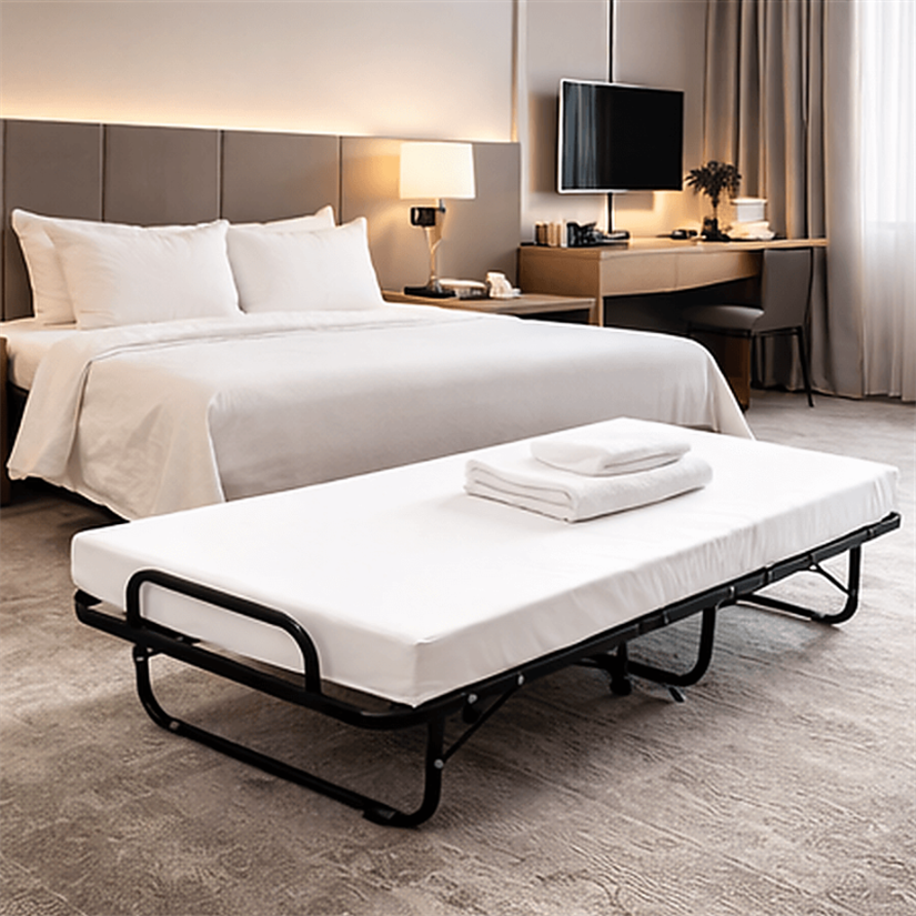 The HOTELUM pat extra cu un cadru cu lamele este o soluție fiabilă pentru operațiunile zilnice ale hotelului atunci când aveți nevoie să crescut capacitatea unei camere rapid. Lamelele flexibile de lemn distribuie presiunea mai bine și susțin o poziție mai confortabilă decât un umplut solid. Cadru metalic negru menține structura stabilă iar salteaua de 10 cm înălțime oferă oaspeților un somn confortabil chiar și în timpul șederilor prelungite. Designul pliabil facilitează manipularea pentru personal și economisește spațiu în timpul depozitării.