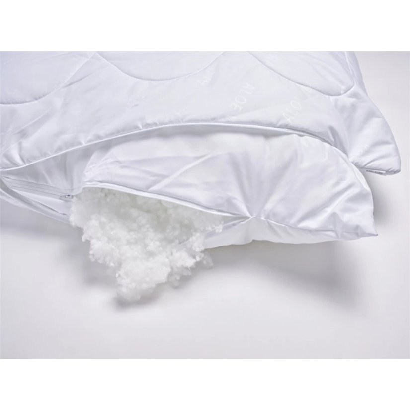 Această pernă conține o umplutură de fibră sferică UNICO de calitate superioară, concepută special pentru producția de perne antialergice. Datorită acestor bile de înaltă calitate, pernele pot fi ușor bătute și nu își schimbă forma. Fibră sferică este în interiorul unei huse separate cu fermoar, care este introdusă în corpul cusut tot cu fermoar. Acesta este un produs foarte practic, unde este posibil să spălați corpul separat fără umplutura, care, datorită husei suplimentare, poate fi ușor îndepărtată din corpul pernei. Ambele huse sunt prevăzute cu închidere cu fermoar, permițând posibilitatea de a adăuga sau îndepărta o parte din umplutură conform necesităților clientului. Materialul de suprafață este 100% poliester - microfibră cu extracte din planta Aloe Vera. Aloe Vera are un efect benefic asupra pielii umane, are capacitatea de a ameliora durerile articulare și musculare. În timpul utilizării, el eliberează treptat extracte din fibrele sale, care au un efect antibacterian pronunțat, garantând în mod sigur distrugerea bacteriilor și acarienilor. Contribuie la relaxarea corpului, la relaxare și la un somn liniștit neîntrerupt. Perna este potrivită pentru persoanele alergice și astmatice.