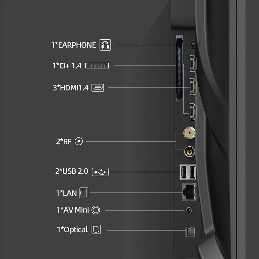 - Intrare AV mini, CI+, intrare căşti 3.5 mm, ieșire audio digitală, HDMI 1.4, USB 2.0, LAN, antene RF și LNB