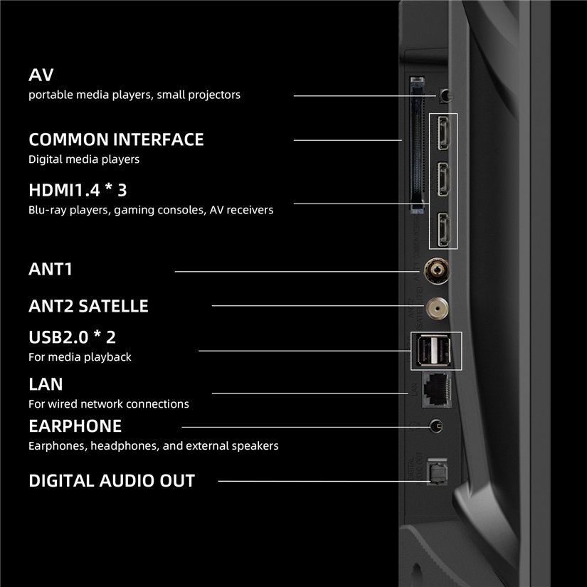 - Intrare AV mini, CI+, ieșire audio digitală, HDMI 2.1, USB 2.0, LAN, antene RF și LNB