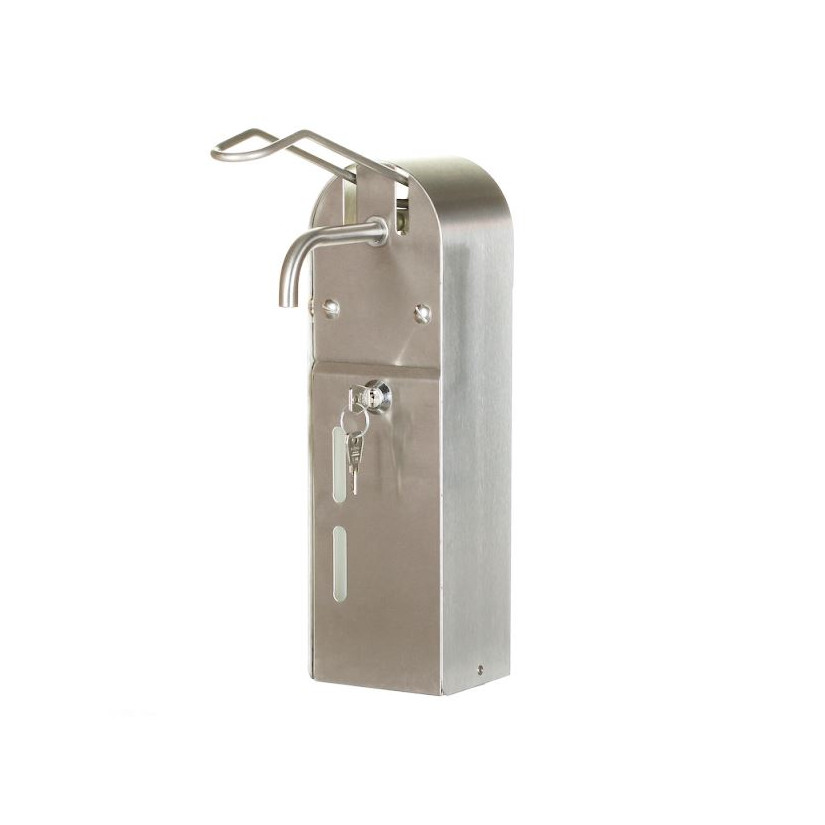 Elbow dispenser for liquid soap or disinfectant solution. Made of high quality stainless steel. Lockable with a key.