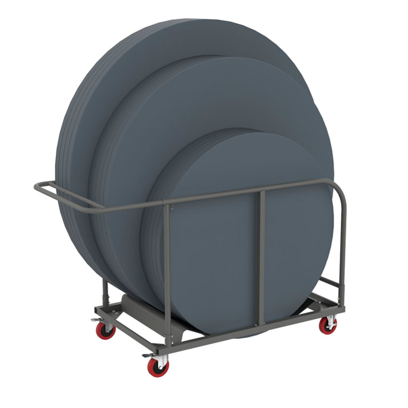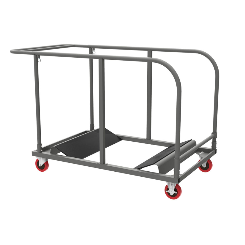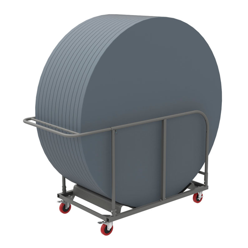 Planet trolley with retractable handle and three adjustable positions. Made of painted steel. Capacity: 15 pcs Planet 120, 15 pcs Planet 150 and 12 pcs Planet 180.