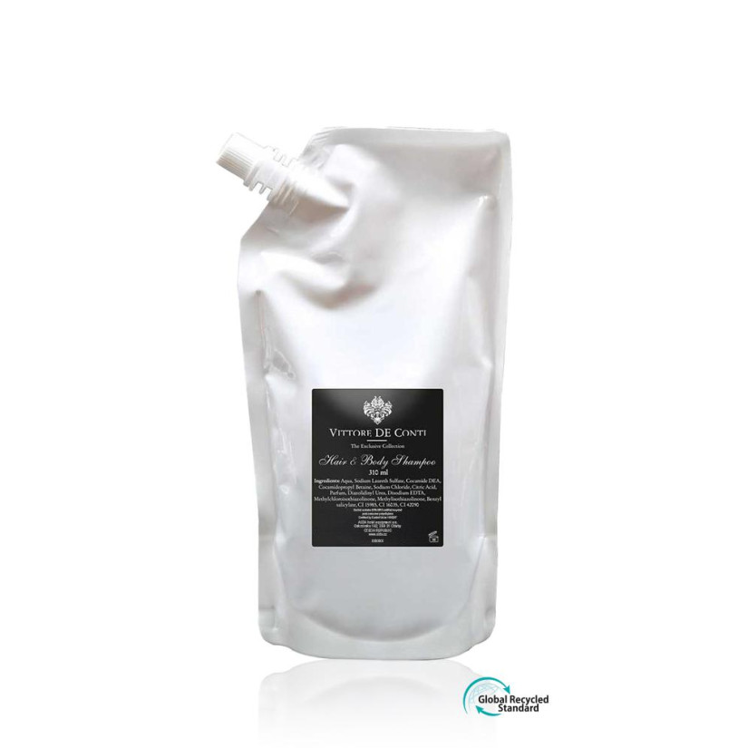 Hair and body shampoo in a 310 ml refill bag from the Vittore De Conti cosmetic line is ideal for hotels, wellness centers and other facilities that emphasize quality and ecology. This shampoo provides gentle cleansing of the skin and hair, leaving it fresh and scented.