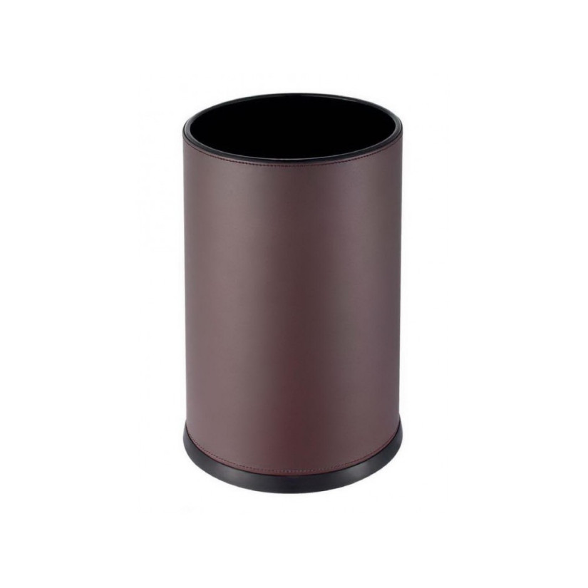 Indoor waste bin with a round, shock-resistant base and an inner jacket made of brown leatherette.