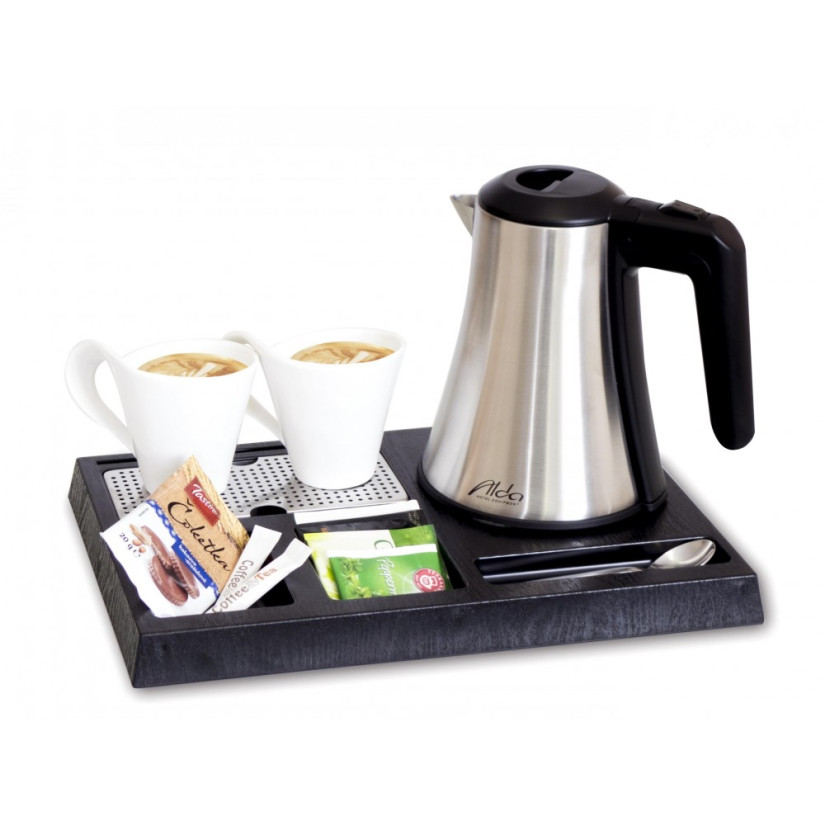Great, modern and elegant kettle set Elegant Inox suitable for every room and kitchen. The tray of the set is made of ABS material faithfully imitating the surface of solid wood. The pressure-cooking stainless steel kettle has a volume of 0.8 liters. The tray contains 2 larger compartments, 1 smaller compartment and a removable drip tray for cups. The base of the kettle is integrated in the tray plate. This kettle set is a great solution for you and your guests.