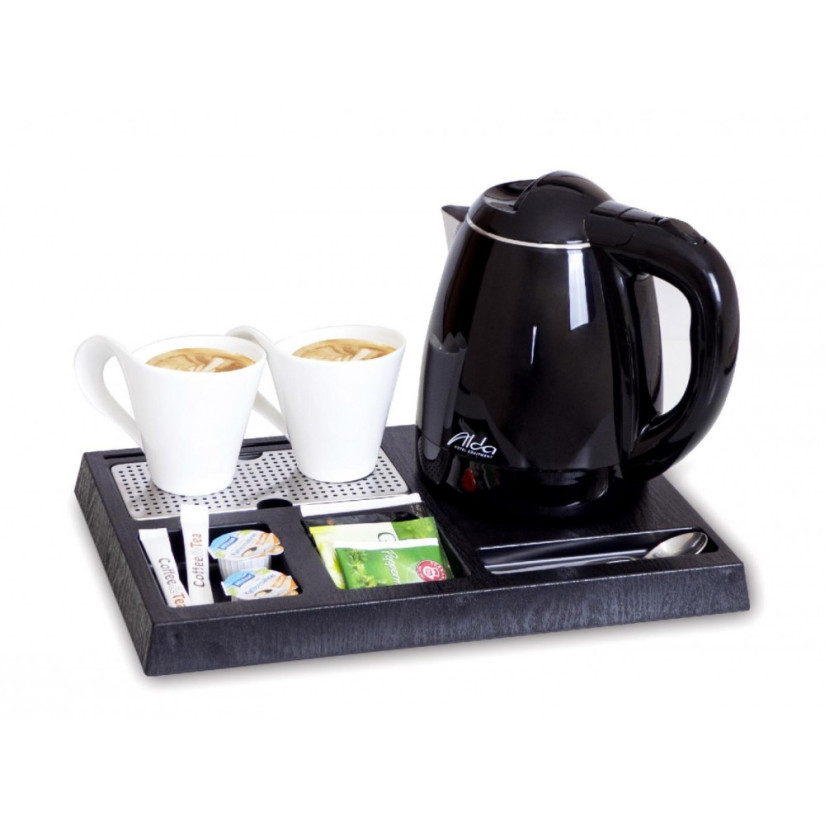 The Prime Black pressure cooker set is a great solution for all those who want to maintain the high standard of their rooms, but at the same time find a "more economical" solution. This kettle set will meet all your expectations. In addition, it is very elegant and has a modern look. The tray of the set is made of ABS material faithfully imitating the surface of wood. The pressure-cooking double-walled kettle has a volume of 1.2 liters and is black in color. The set tray contains 2 larger compartments, 1 smaller compartment and a removable drip tray for cups. The base of the kettle is fully integrated into the tray plate.